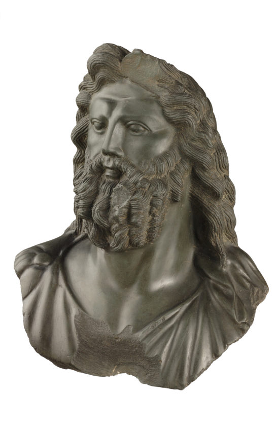 The god’s majestic head, turned slightly to the right, his wavy, centrally-parted hair, flowing in spiralling locks to his shoulders and swept up over the forehead, with a luxuriant flowing beard and moustache with overlapping corkscrew curls, his lips are slightly parted, with unarticulated wide-set eyes, a hole on top of the head for insertion of the, now missing, modius