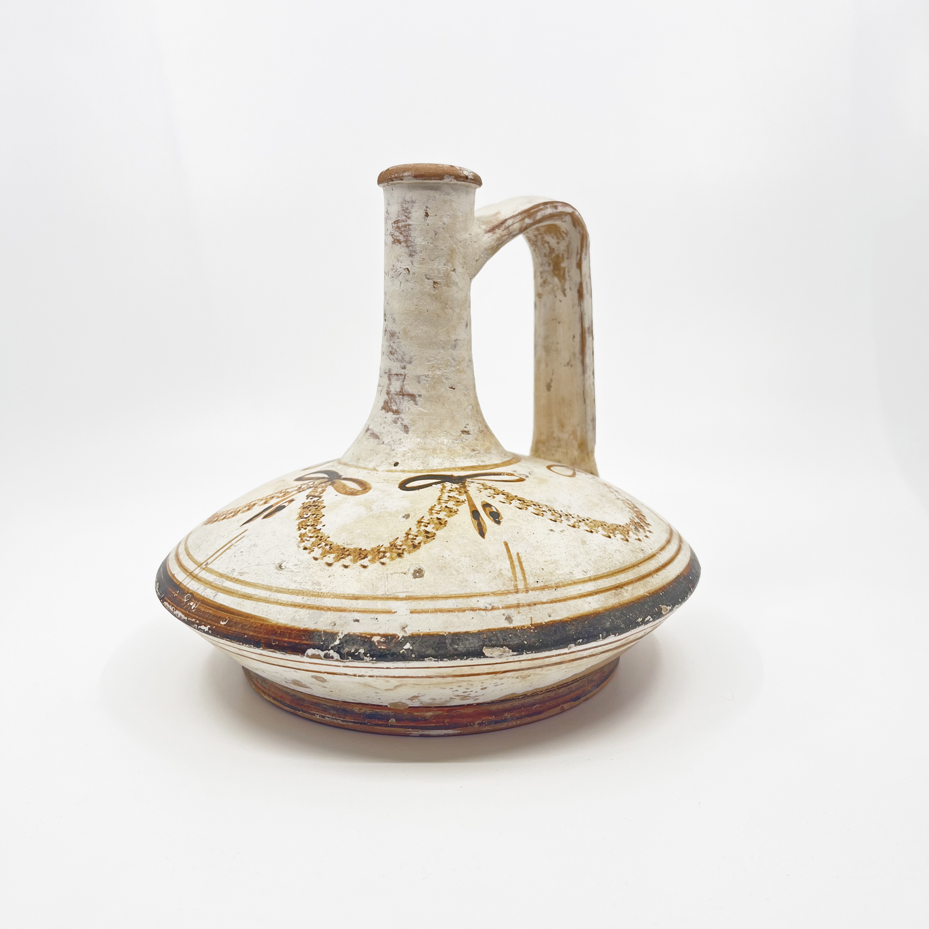 The lagynos was a wine pot used in banquets, and particularly popular during the Hellenistic age. A passage attributed to Eratosthenes, cited by Athenaeus (VII, 276a-c), describes a feast established by Ptolemy IV Filopatore called ‘Lagynophoria’. This banquet was held in Alexandria to honour Dionysus, and each participant would drink wine from his own lagynos. The canonical motifs consists of wreaths, olive bows, baskets, and lagynoi themselves painted in a thinned orange-brown slip on a white ground.