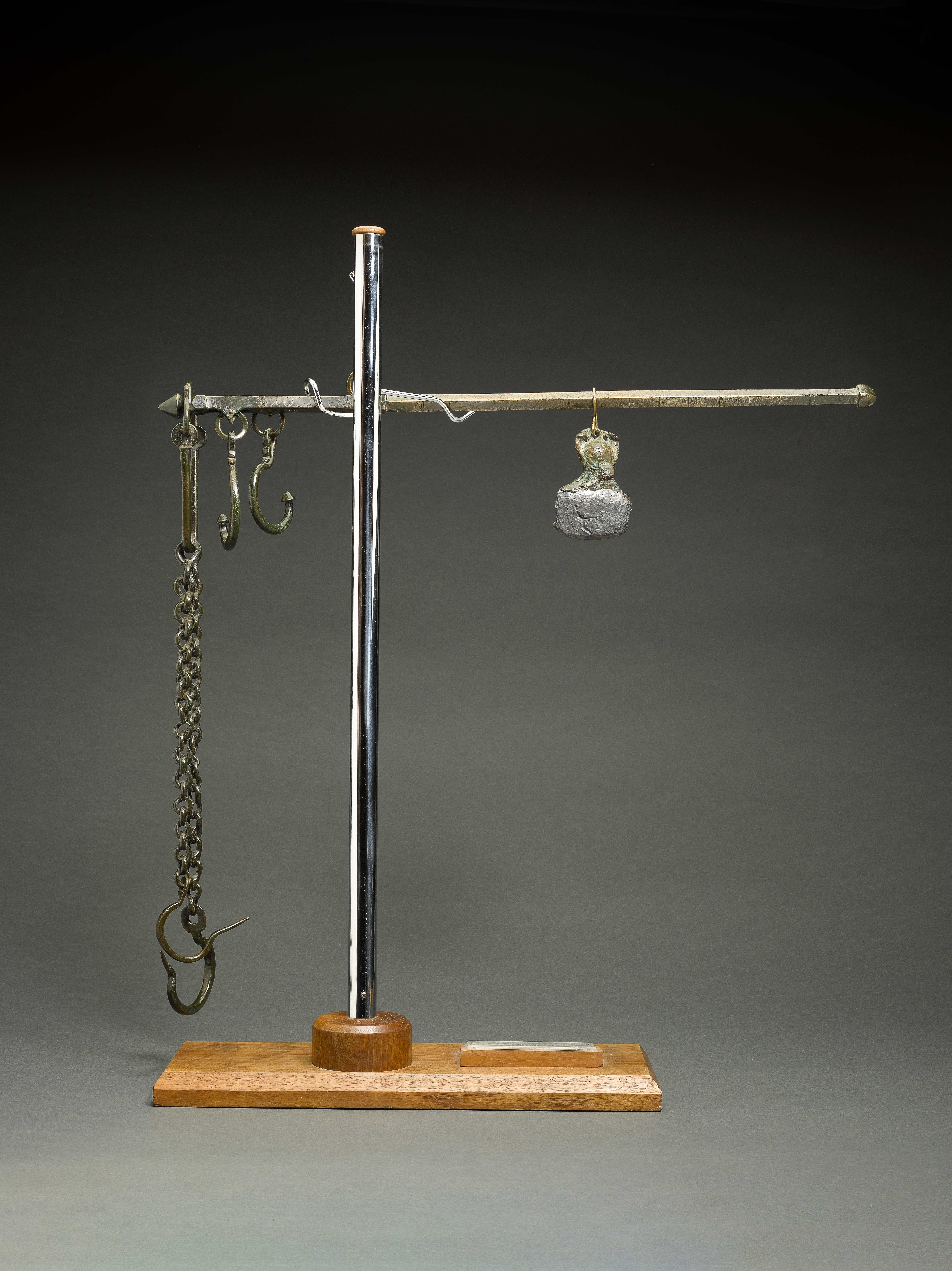 Steelyard balances were popular devices for weighing all kinds of commodities, and were used during the Roman and early Byzantine periods. Generally thought to have been invented by the Romans, the steelyard is an unequal arm balance with an adaptable fulcrum and movable counterweight. The collar, which held the hooks on the long chains, was fitted over the shorter end with the various suspension hooks, while the sliding counterweight moved along the other end of the long calibrated rod. See Vitruvius' description in his "De Architectura," Book X, 3-4.