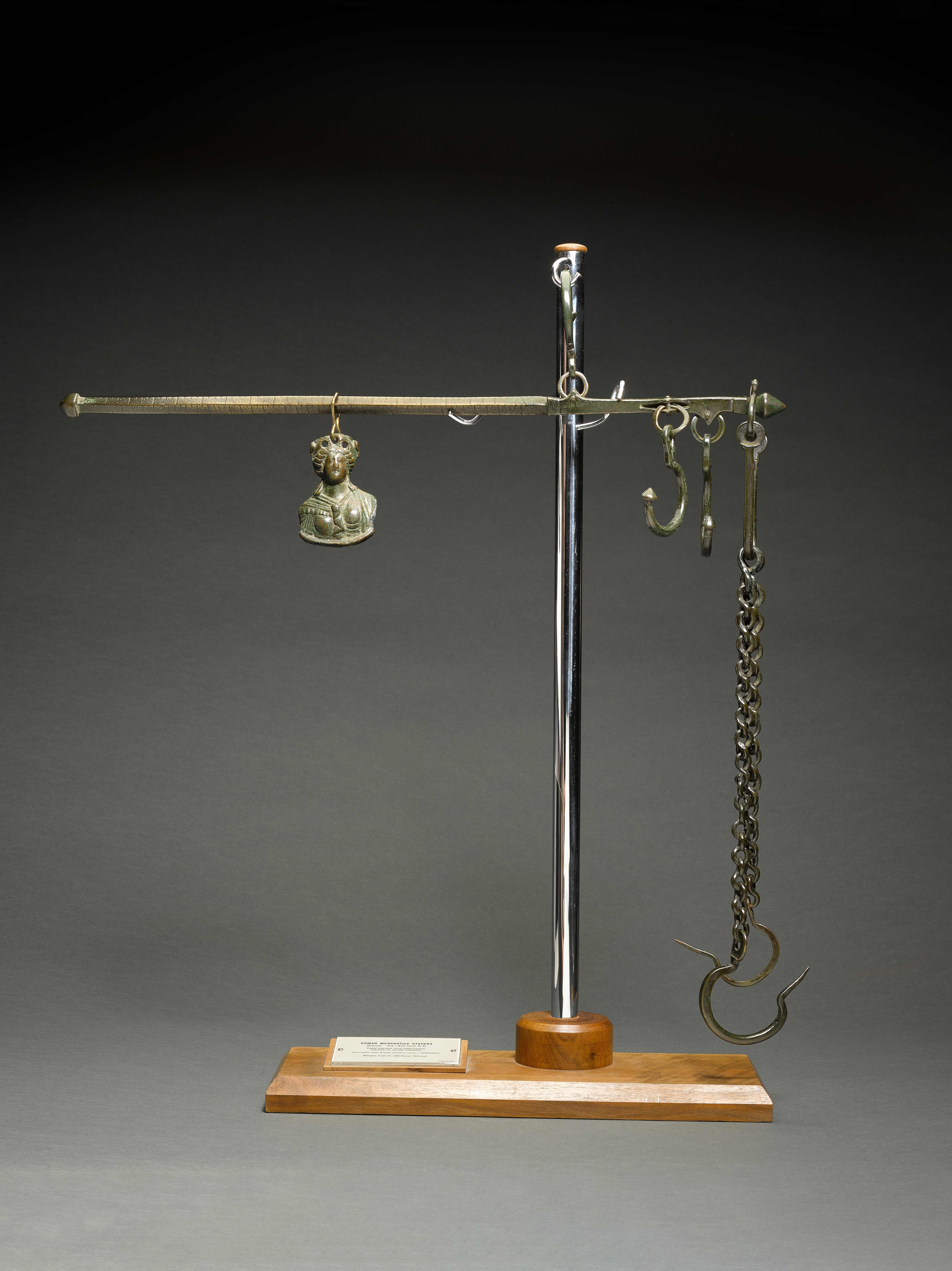 The steelyard consists of a rectangular, sectioned bar with conical terminals, engraved on three sides with a scale in Roman librae, though shown in Greek characters. Two suspension hooks are attached to a chain at the opposite end to the weight, with two additional hooks suspended on rings. The lead-filled weight is in the shape of a female bust, possibly Athena, suspended from a small ring. The bar is inscribed with the owner's name, ‘THURSOS'.
