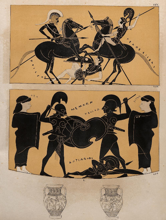 Our Amphora depicting the combat of Memnon and Achilles over Antilochos, the group’s eponymous amphora, is among the finest of the group and the only amphora of the Memnon group wearing named inscription - in Ionic alphabet. Pseudo-Chalcidian vase painting is an important style among black-figure Greek vase painting. It was strongly influenced by Chalcidian, but also shows influences from Attic and Corinthian vase painting. The potters used the Ionic alphabet for added inscriptions. As per today we know about 60 vases of the style - studied by Andreas Rumpf for the first time in 1927. The potters/painters may have been the successors of those who produced Chalcidian pottery, as well as some potters newly immigrated to Etruria. Pseudo-Chalcidian vase painting is divided into two groups: the Polyphemus Group and The Memnon Group. The first group produced the majority of known vases, mainly neck amphorae and oinochai. They show groups of animals, mythological imagery is rare. The vessels were found in Etruria and Sicily, but also in Marseille and Vix. The Μemnon Group, to which only 12 vases can be attributed, had a much less extensive distribution, limited exclusively to Etruria and Sicily. Except for one oinochoe, the Memnon group only produced neck amphorae, usually decorated with animals and horsemen. Mythological scenes are rare.