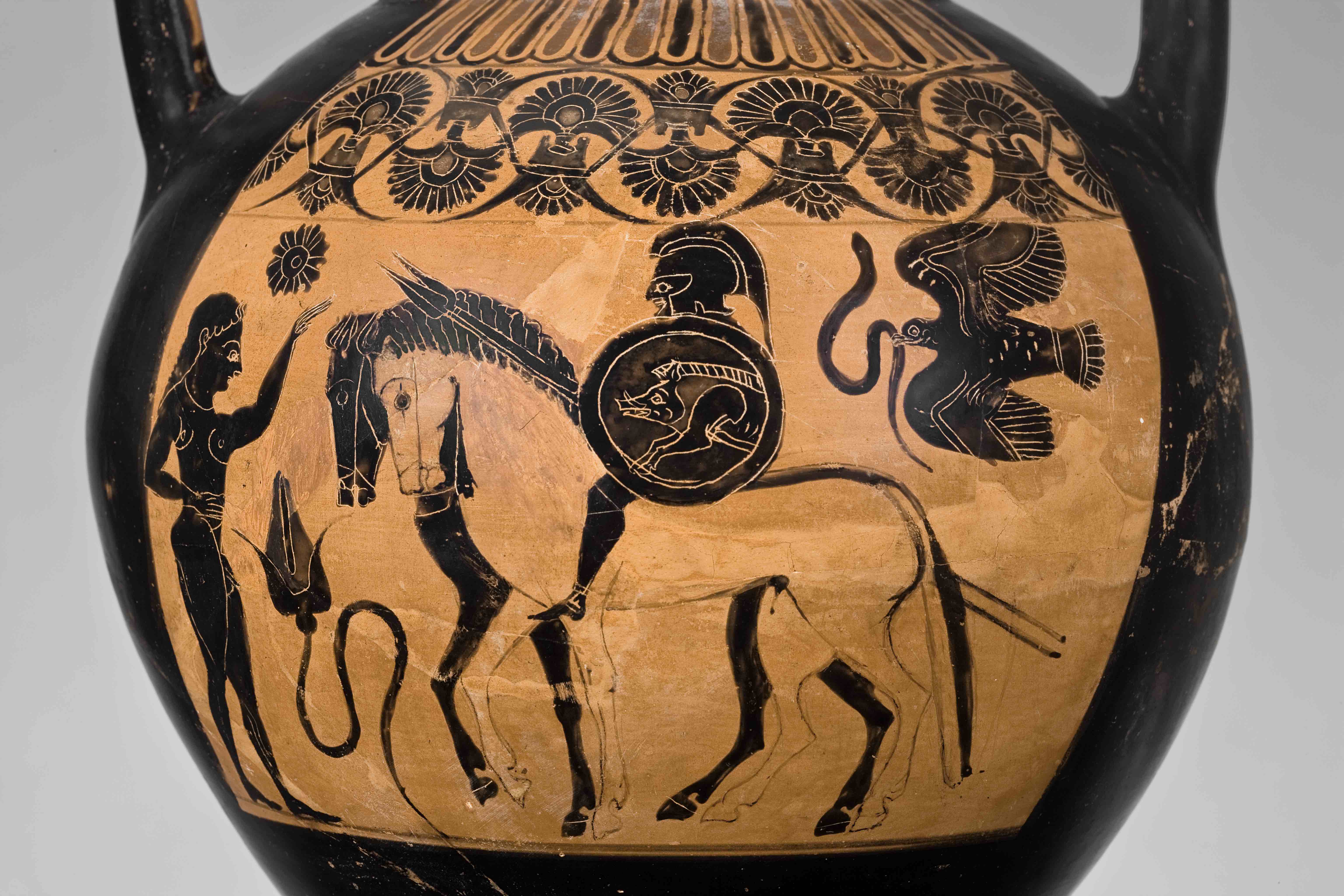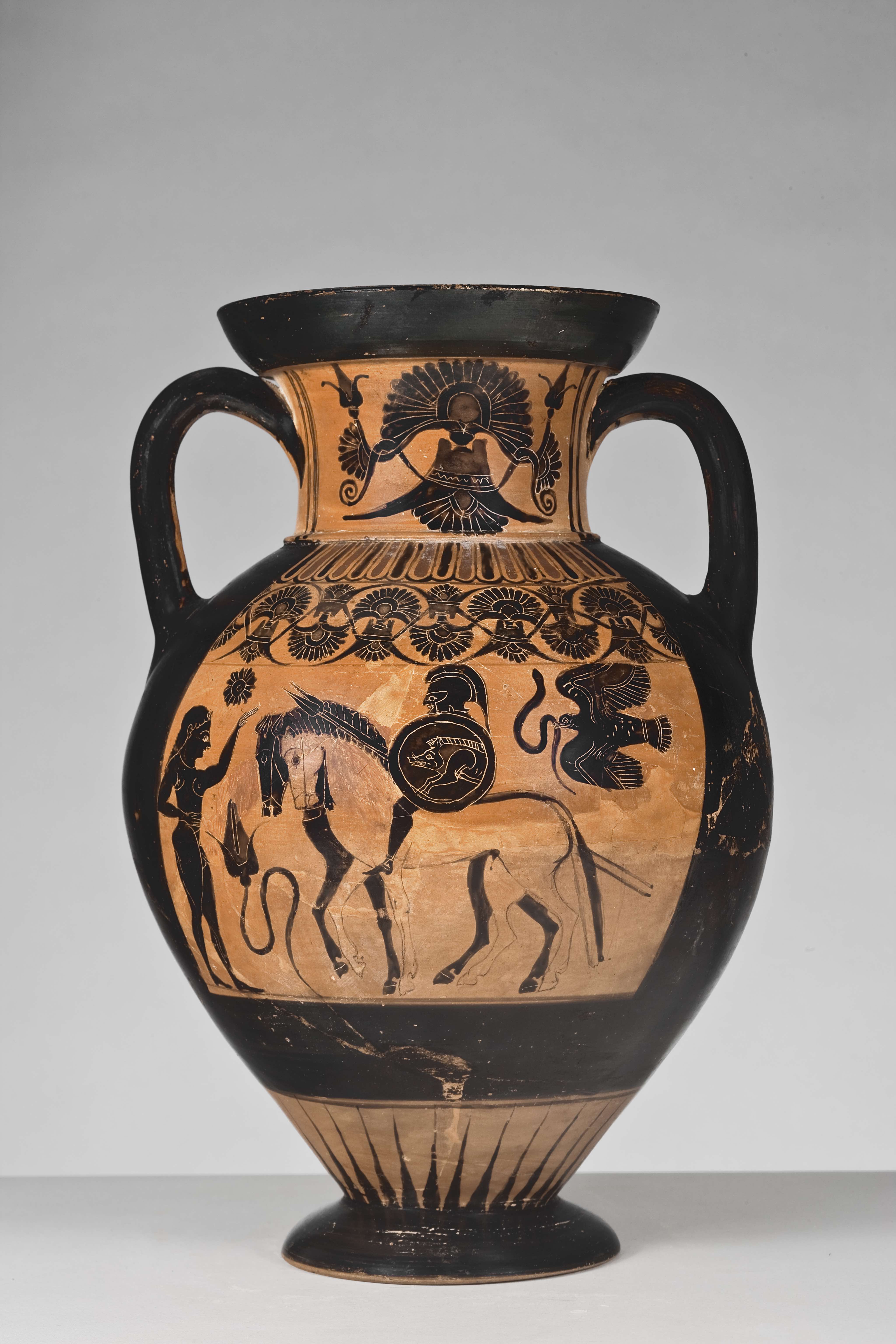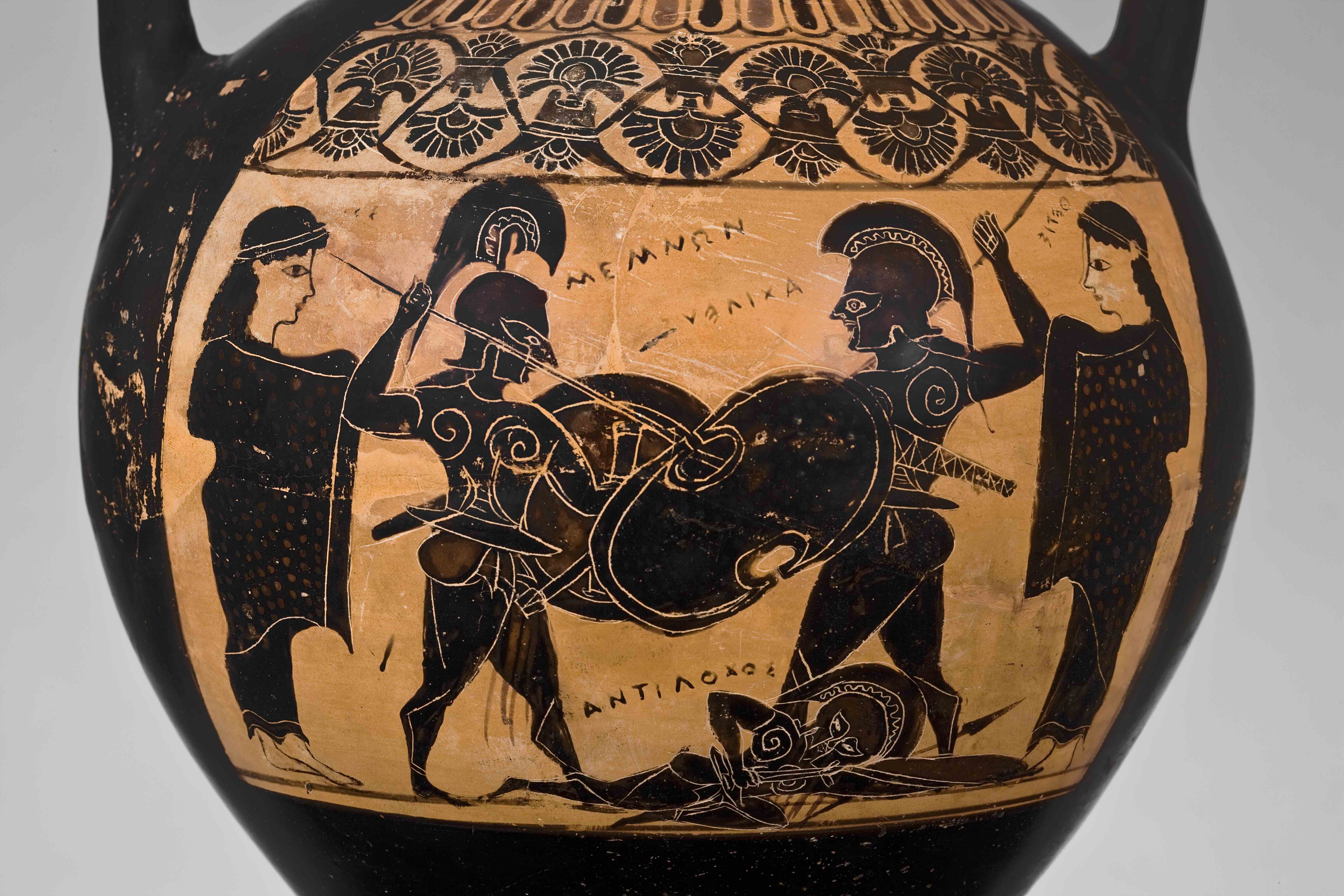 The pseudo-Chalcidian black-figure neck amphora is decorated on each side with a figured panel. On the obverse is depicted the combat between Memnon, king of Ethiopia, and Achilles on the battlefield over the dead body of Antilochos. The two heroes are shown fully armed, each wearing a crested Corinthian helmet, cuirass, and greaves, and carrying a shield and spear. Achilles’ spear is shown piercing Memnon’s thigh at the moment of impact. The scene is flanked by the mothers of the heroes, Eos and Thetis, who stand on either side wearing himatia decorated with red dots. All the figures are identified by inscriptions in the Ionic alphabet. The reverse depicts a mounted hoplite accompanied by his horse, facing an ephebe standing before him. In the field, a flying bird grasping a snake, a rosette, and a lotus bud. The neck is ornamented with an antithetic palmette and lotus-bud frieze between two horizontal lines. The shoulder is decorated with alternating red and black tongues, while below runs a double palmette and lotus chain. Rays encircle the foot of the vessel. Details throughout are enriched with added red. Memnon, the Ethiopian king and son of Eos, arrived at Troy to aid the Trojans in the final phase of the war. Celebrated for his beauty, strength, and prowess in battle, he quickly proved himself a formidable opponent. In the fighting, Memnon slew Antilochos, the youngest son of Nestor, a devoted Greek warrior renowned for his courage and loyalty. Antilochos’ death deeply affected the Greeks, underscoring the profound human cost of the conflict - even among its greatest heroes. Seeking to avenge his fallen comrade, Achilles challenged Memnon to single combat and killed him. Their encounter reflects the recurring cycle of heroism, vengeance, and mortality central to Greek myth, illuminating themes of bravery, loyalty, and the inexorable destiny that binds mortals under the will of the gods.