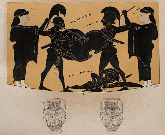 Our Amphora depicting the combat of Memnon and Achilles over Antilochos, the group’s eponymous amphora, is among the finest of the group and the only amphora of the Memnon group wearing named inscription - in Ionic alphabet. Pseudo-Chalcidian vase painting is an important style among black-figure Greek vase painting. It was strongly influenced by Chalcidian, but also shows influences from Attic and Corinthian vase painting. The potters used the Ionic alphabet for added inscriptions. As per today we know about 60 vases of the style - studied by Andreas Rumpf for the first time in 1927. The potters/painters may have been the successors of those who produced Chalcidian pottery, as well as some potters newly immigrated to Etruria. Pseudo-Chalcidian vase painting is divided into two groups: the Polyphemus Group and The Memnon Group. The first group produced the majority of known vases, mainly neck amphorae and oinochai. They show groups of animals, mythological imagery is rare. The vessels were found in Etruria and Sicily, but also in Marseille and Vix. The Μemnon Group, to which only 12 vases can be attributed, had a much less extensive distribution, limited exclusively to Etruria and Sicily. Except for one oinochoe, the Memnon group only produced neck amphorae, usually decorated with animals and horsemen. Mythological scenes are rare.