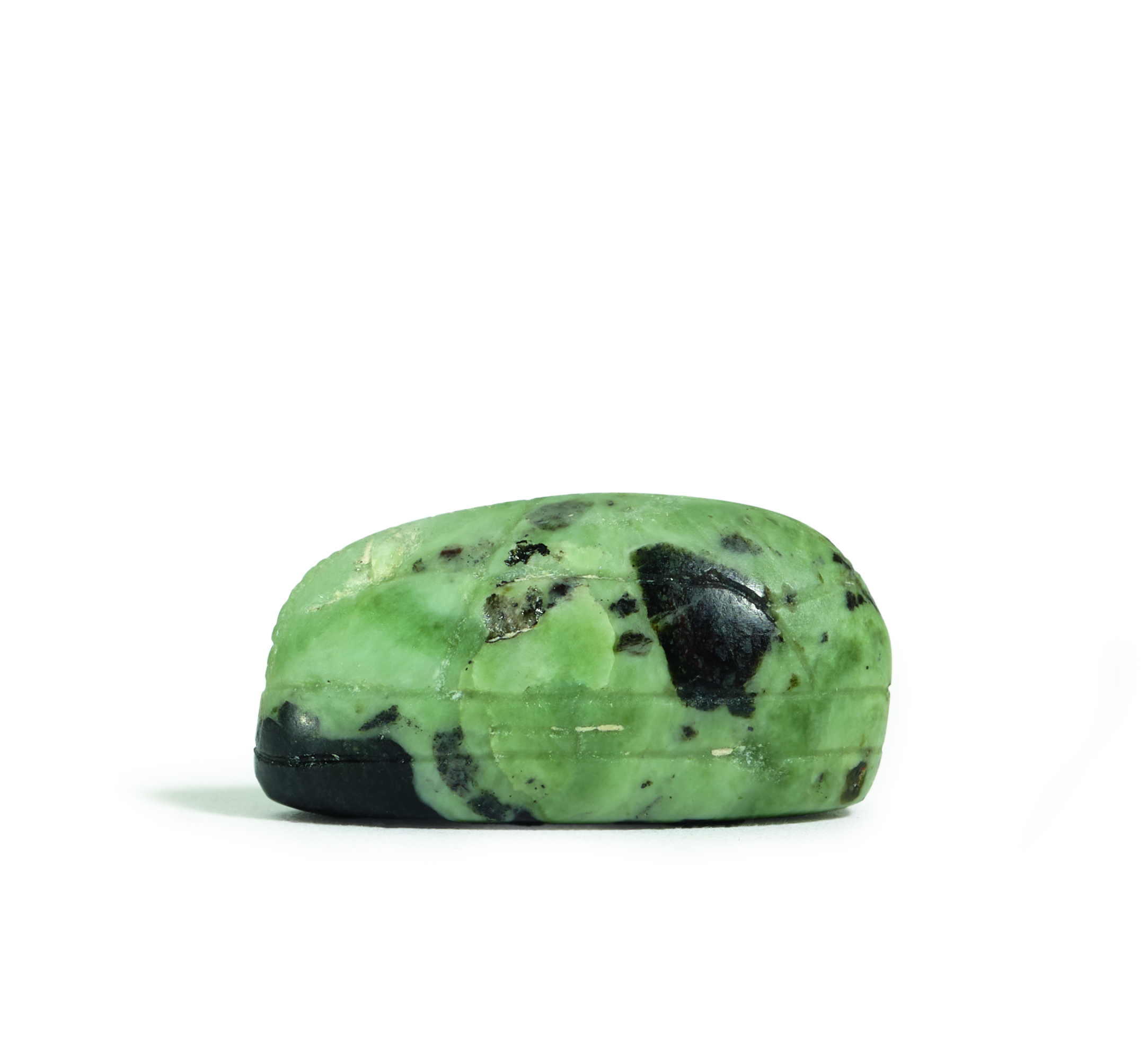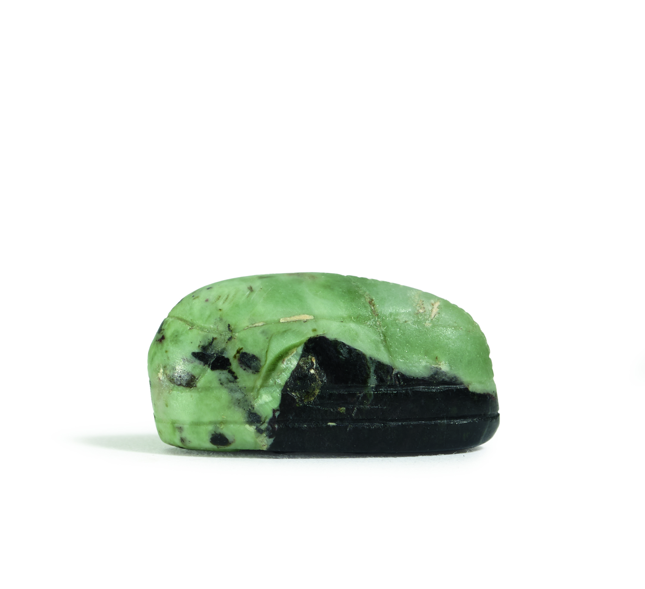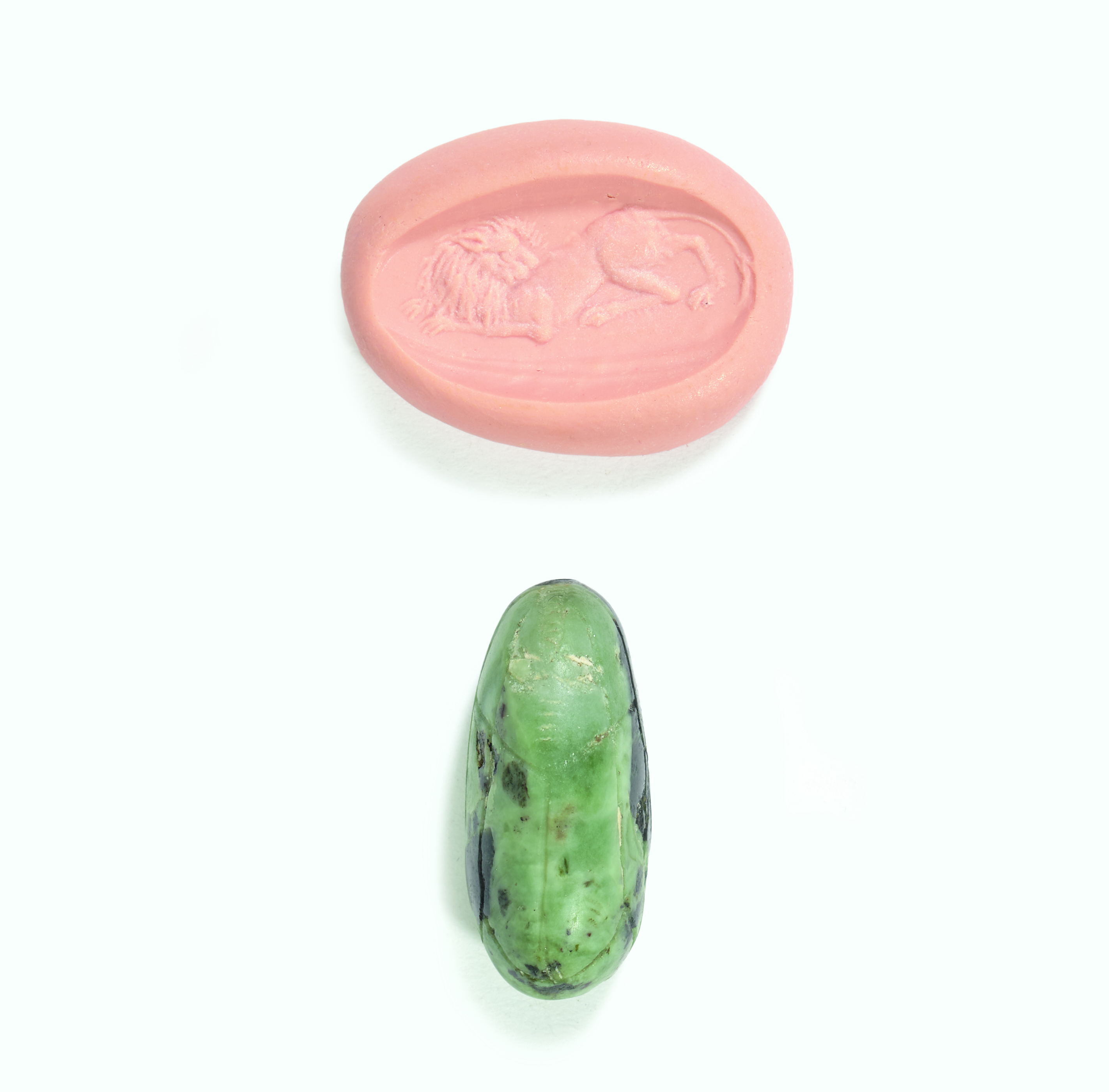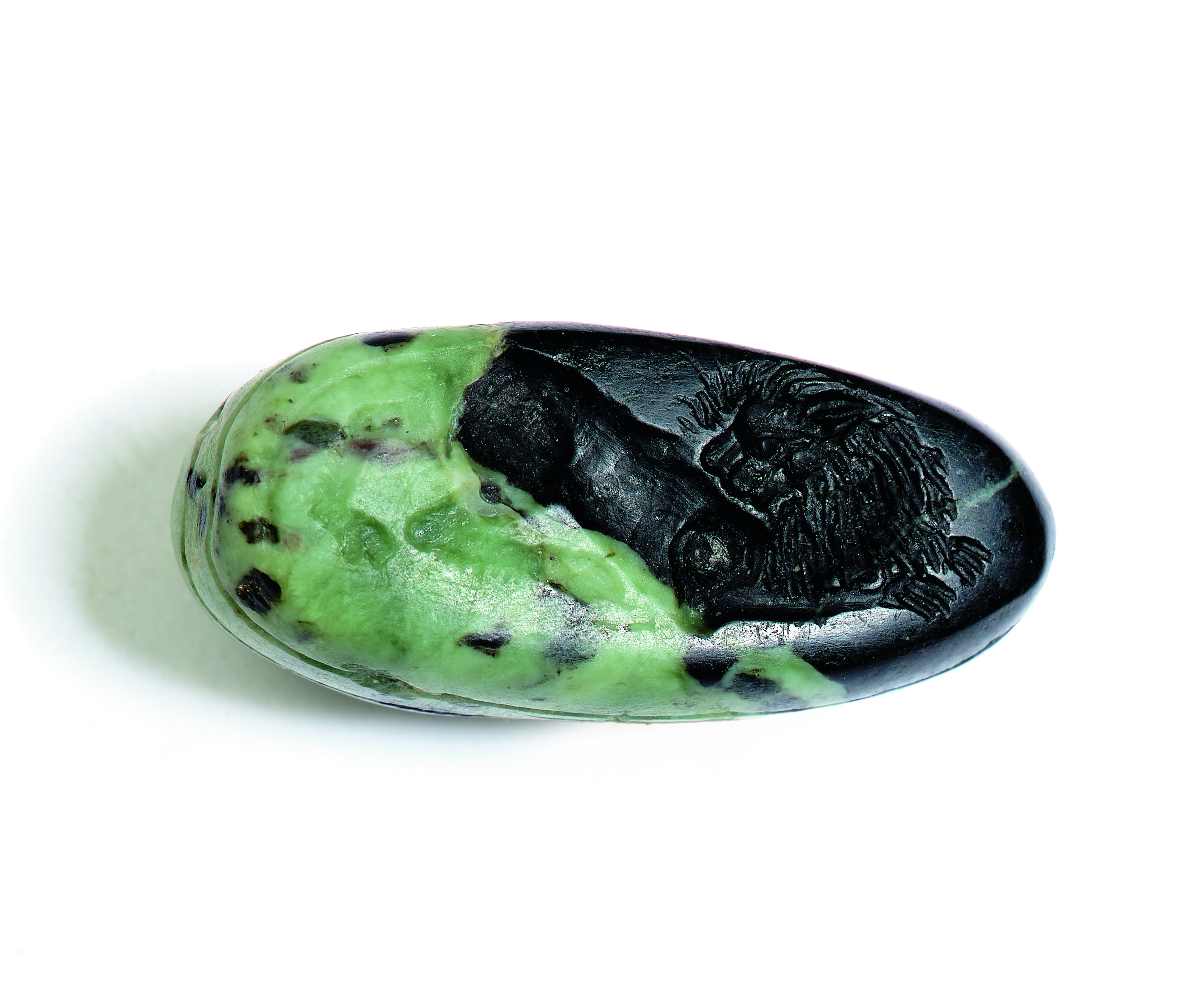 This stylized scarab features the depiction of an exquisitely crafted lion looking back over its shoulder. The lion’s body is elongated, its mane consists of fine, protruding tufts of hair, and the eye stands out prominently. This last characteristic may indicate that the scarab had an apotropaic, meaning protective, function.