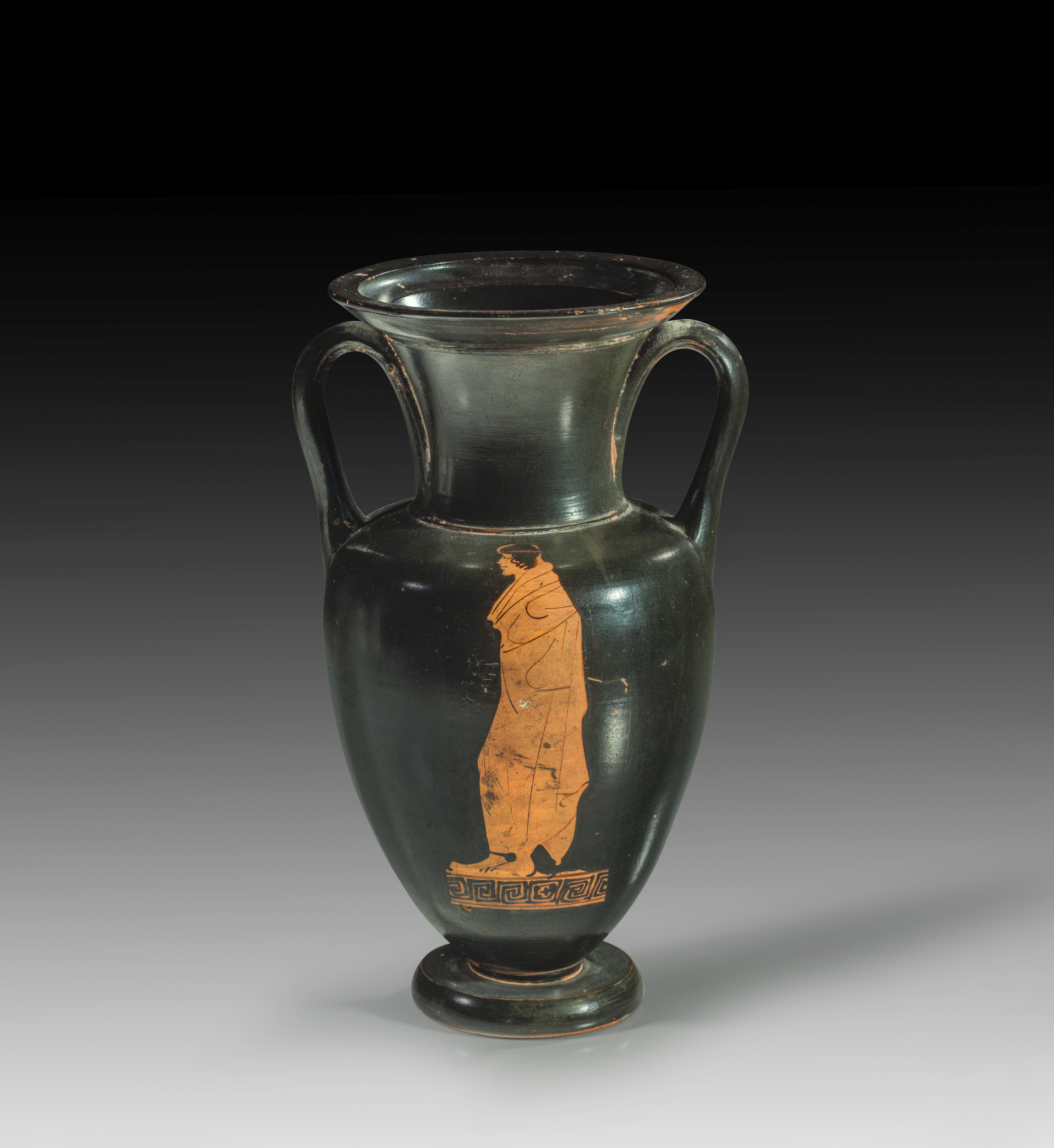 On the obverse, a young woman stands holding a phiale and an oinochoe. The artist renders the latter in a bold, slightly oblique view, accentuated by the stream of wine being poured. She wears her hair neatly bound under a sakkos and is dressed in a chiton and himation. On the reverse, a draped youth is depicted. Both figures stand upon a short meander band. Added red highlights details such as the hair ties and the wine. The amphora itself has an echinus mouth, ridged handles and an echinus foot.